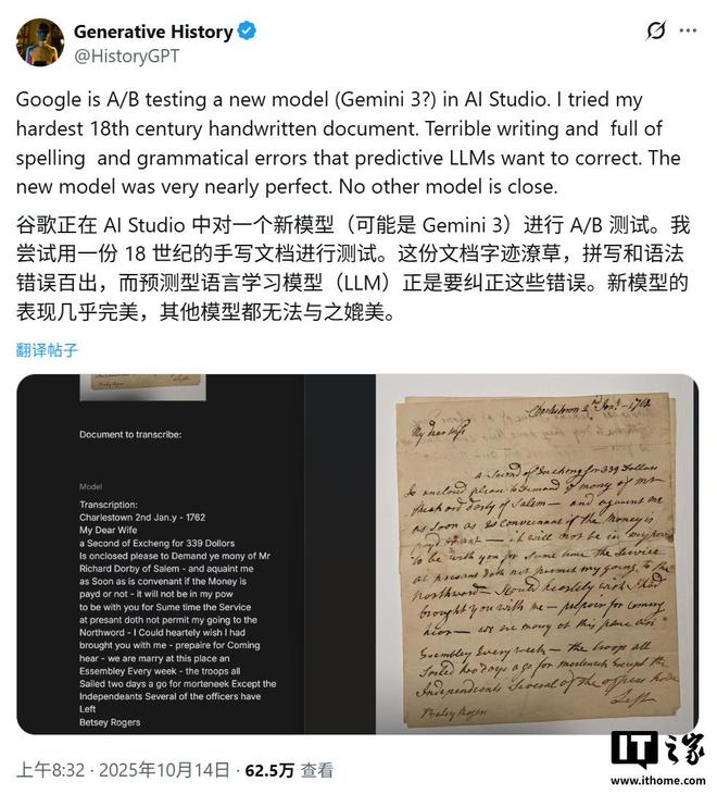 IT之家 11 月 16 日报道 科技媒体 Golem 昨日(11 月 15 日)发表博文,报道谷歌通过其 AI studio 平台,正在测试一种尚未命名的 AI 模型,该模型接近人类专家破译难以破译的历史手稿的水平。它援引一篇博客文章称,历史学家马克·汉弗莱斯(Mark Humphries)使用专门开发的基准数据集来系统地测试模型的性能。结果显示,在处理5份较难的历史手稿时,该模型的整体字符错误率约为1.7%,大多数错误涉及标点符号和大小写,而不是单词本身。 Humphries 的分析进一步指出,在不计入歧义标点符号和大写错误的情况下,AI 模型的字符错误率降低至 0.56% 左右,相当于每转录 200 个字符就有 1 个错误。奥尔巴尼分类帐的页面抄录自新的版本,其准确性令人惊讶。发现的未知双子座模型的性能与抄写历史文献的专业人类工作者相当。测试的文档涵盖了18至19世纪的各种笔迹风格,包括笔迹难以辨认、拼写错误和语法不一致的复杂样本,进一步凸显了该模型的强大功能。该模型最令人惊讶的表现是它超越了简单的文本转录,并展示了复杂的推理能力。在编写18号商人的日记时,原文中包含了一份糖购买记录,仅标有数字“145”,没有计量单位。谷歌的人工智能模型没有直接翻译“145”,而是翻译“14磅,5盎司”。研究人员发现,AI通过逆向计算账本中记录的总价,并结合英国货币(英镑、先令、笔)之间的关系,成功推导出了这个结果。ce) 和时间重量单位。虽然初步结果令人鼓舞,但汉弗莱斯也强调了当前分析的局限性。由于该模型通过 A/B 测试偶尔出现,因此对其进行大规模系统测试存在困难,并且迄今为止仅分析了基准数据集中约 10% 的样本。