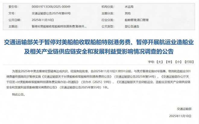 图为交通运输部官网截图。 11月10日,交通运输部发布公告,为落实2025年中美吉隆坡经贸磋商达成的共识,经国务院批准,自2025年11月10日13时01分起,暂停在美国实施经贸磋商。针对海事、物流和造船业的301调查的最后步骤同时暂停。关于对在美国船舶征收特殊港口费的执行措施的通知》(交办税[2025]号)11月10日起限制对华301调查。当地时间11月9日,美国贸易代表办公室(USTR)发布公告,除暂停对华301调查相关措施外,美国贸易、物流和航运业将暂停一年。当地时间11月6日,美国贸易代表办公室发布公告称,自11月10日起,自当地时间周五(7日)下午起对中国采取所有惩罚措施。与主要盟友和合作伙伴的行业。