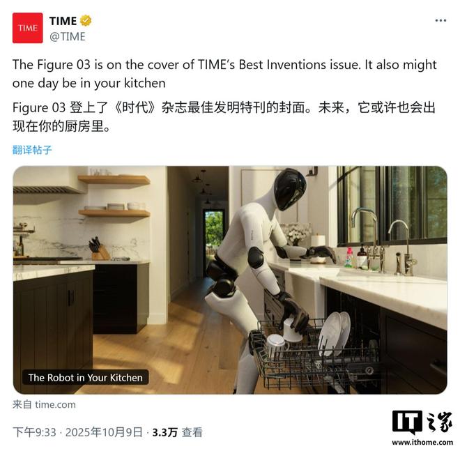 IT之家10月10日报道 昨天(10月9日星期四),AI人物推出了新一代通用人形机器人写真03。它定位于家庭日常服务,帮助您完成叠衣服、洗碗、整理房间等复杂的家务活动。 IT之家在公开搜索信息发现,图 03 与 Unitree R1 一起入选《时代》杂志 2025 年最现代机器人榜单。图AI的愿景是打造一款既能做家务又能做工业生产的通用人形机器人。目前正吸引众多巨头科技的关注。今年9月,宣布获得10亿美元融资,公司增值390亿美元。名单中包括Nvidia、Openai、微软和杰夫·贝佐斯等重量级人物。在技术方面,Figure AI 之前使用过 Openai 的模型,但现已移交给 Helix 神经网络系统的所有者。该系统模仿人类认知结构,分为三个部分:“零系统”负责处理平衡等低水平的自然反应,保证机器人在复杂环境下能够稳固站立和行走; “系统一”类似于人类神经系统,负责将高级指令转换为每秒高达200次的精确运动控制;而“系统二”则扮演逻辑大脑的角色,利用开源的人工智能模型来了解情况、进行推理并做出决策。图03借助这套自主开发的系统,它不仅可以响应语音命令,还具有实时查看和了解环境的能力,使其无需预设脚本即可执行复杂的自主动作。在硬件设计方面,图03高5英尺6英寸(约1.68米),重132磅(约60公斤)双标)。充满电后可连续工作长达5小时,并通过专用平台进行无线充电。为了提高环境接触的准确性,图 03 在每个手掌中都嵌入了摄像头。这种设计使得机器人即使在主摄像头被遮挡(例如到达柜子)时也能获得近距离的视觉反馈,从而在拍摄和操纵mgA物体时实现更准确和自适应的实时控制。根据官方演示视频,Figure 03可以执行多种家庭活动,包括给植物浇水、送餐、叠衣服、整理房间等。公司兼CEO创始人Brett Adcock在社交媒体上强调,所有演示视频动作都是机器人自主完成的,无需任何远程控制。 Figure Ai 首席执行官 Brett Adcock 对人形机器人的未来非常乐观。他预测,未来十年内,世界上最大的公司将是一家机器人公司当人形机器人走进千家万户,数十亿机器人加入工人的行列,覆盖医疗、服务甚至太空探索等领域。他认为通用机器人技术将在18到24个月内被淹没。 Figure AI 正在与特斯拉的 Optimus 和中国的 unitree 等公司竞争,争夺据 Adcock 估计价值 40 万亿美元的全球劳动力市场。