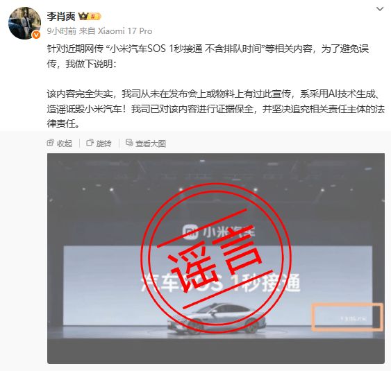据美联社10月23日报道,针对近期网上流传的“小米汽车SOS 1秒接通,不含排队时间”等相关内容,小米汽车副总裁李小双在微博发文:该内容完全不实。该公司从未在新闻发布会或材料中公开过这一点。它是利用人工智能技术来散布谣言、诽谤小米汽车的。公司对此内容保留证据,并决心追究相关责任方的法律责任。小米汽车副总裁李小双否认网上传闻