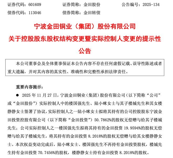 宁波富豪楼国强家族重新分配内部资产,价值34亿元的股票完成代际传承。 11月29日,金田股份(601609)公告称,控股股东宁波金田投资控股有限公司(以下简称“金田投资”)股权结构将发生变更。据悉,该公司实际控制人楼国强、卢小米与其子楼成、楼晶晶签署了协议。卢小米、楼国强拟将其持有的金天投资50.7862%、19.9594%的股权分别无偿赠与楼成;同时,楼国强拟将其持有的金天投资8.2018%的股权无偿赠予楼晶晶。完成前述股权变更后,卢将不再持有小米,楼国强为金田投资股权。楼成持有金天投资70.7456%股权,楼晶晶持有金天投资70.7456%股权。持有金田投资8.2018%股权。金田投资持有金田股份4.23亿股,占上市公司总股本的24.49%,市值约43.19亿元。根据上述分配方案,楼成、楼晶晶非直接持有的上市公司股份市值分别为30.55亿元、3.54亿元,合计约34亿元。据程实互动介绍,楼国强1957年出生于浙江宁波。目前,他担任金田股份有限公司名誉董事长。据公开报道,楼国强领导的庙山砂轮厂(金田股份有限公司前身)一度濒临破产,逐步成长为中国民营企业500强之一。楼国强1973年参加工作,1985年1月任宁波市庙山乡工业办事处副主任。1986年,他接手管理濒临破产、几近废墟的庙山砂轮厂。当时,工厂仅有员工7人,固定资产12万元,负债累累。面对危机,楼国强带领业务团队奔赴东部沿海,广泛开展市场调研,掌握了大量经济数据。楼国强放弃砂轮磨削业务,转行铜加工!楼国强这个想法一提出,就遭到了穆拉很多人的反对。激烈的对抗并没有阻止楼国强的脚步。他是一个看到路就走到底的人。庙山铜材厂就这样开始了。 1987年,楼国强带领团队研制成功H59、H62铜杆。 1991年,公司产值突破2000万元。 1993年,他热情地看到了厌氧线的市场前景,立即推出了该产品离子线。当年公司总产值达到1.2亿元。 2008年以来,楼国强加快了金田集团进军国际市场的步伐。目前,该公司已在美国、德国、日本、韩国、泰国、越南、中国香港等地开展业务。 2020年,63岁的楼国强领导的宁波金田铜业(集团)股份有限公司在上海证券交易所主板上市。如今金田集团已从一家以铜冶炼加工为主的企业升级成为国内铜及铜合金材料产业链完整、品种最多、规模最大的企业之一。也是国内稀有磁性材料行业技术含量较高、产品体系较齐全的企业之一。拥有宁波总部、宁波杭州湾、江渝、广东、包头以及国内外的中国500强企业统治越南、泰国等生产基地。员工人数达到8000多人。楼国强也被誉为“宁波铜王”。在2025年胡润富豪榜中,楼国强家族以90亿美元的财富排名第807位。其主要资产为上市公司上市公司金田。公开资料显示,2021年至2024年,金田铜产量年复合增长率为8%。 2024年,公司将实现铜及铜合金材料总产量191.62万吨,铜总产量位居全球第一。 2025年上半年,金田股份实现铜及铜合金材料总产量91.98万吨,继续保持行业领先地位。今年前三季度,公司实现营业利润917.65亿元;净利润5.88亿元,同比增长104.37%。卢小米出生于1959年,1988年7月至2007年9月,卢小米在金田投资及其前身历任车间操作员、总采购、采购部部长、采购部科员; 2007年9月至2009年2月任金田投资执行董事、总经理; 2009年2月退休。楼成和楼晶晶都是80后。楼成于2011年7月加入金田股份有限公司,担任公司秘书、总裁助理。 2017年12月起担任公司总经理,2023年4月起担任公司董事长、总经理。2023年5月起担任金田投资董事长。楼成楼晶晶于2007年12月至2017年3月担任金田股份有限公司人力资源部副经理、总裁助理。上市公司表示,本次股权变动系金田股份家族内部股权结构调整。公司实际控制人,不涉及金天投资所持公司股份变动,也不构成要约收购。股权变更后,公司控股股东仍为金天投资,实际控制人成员由楼国强、卢小米、楼成调整为楼国强(仍直接持有金天投资18.63%股份)、楼成。公司控股股东、实际控制人及其一致行动人持有公司股份总数及比例未发生变化。二级市场上,金田股份12月1日上涨1.67%至10.38元,最新市值为179亿元。 。