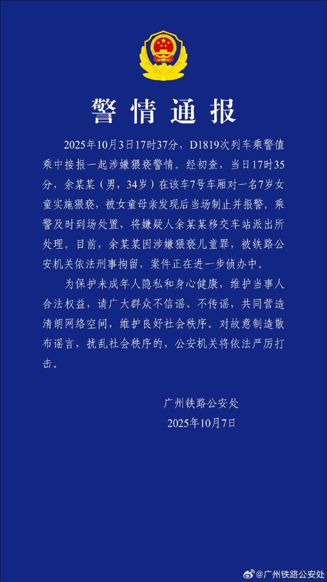 广州铁路警方10月7日通报,10月3日17时37分,D1819次列车上的民警接到疑似在执勤期间猥亵的举报。经初步调查发现,当日17时35分,于某某(男,34岁)在7号车厢内安抚一名7岁女童。女孩的母亲发现了这件事,将她从现场拦了下来,并报了警。民警立即赶到现场,将犯罪嫌疑人余某某移送派出所处理。目前,于某某因涉嫌儿童暴动罪已被铁路公安局刑警依法刑事拘留,案件正在进一步侦办中。警方报告截图
